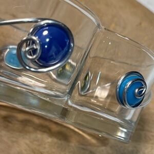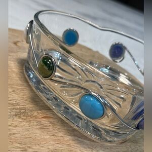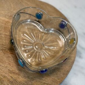 Clear Glass Colorful Beaded And Wire Wrapped Art App Dish Candy or Nuts. Piece could be used for many things or just display as a beautiful art piece. Measures approximately 6.25 x 5.5.