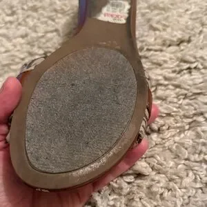 Elegant Guess slides with a tan patterned strap. Gold 'G' logo adds a chic touch.
