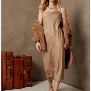 Chic camel dress with a sleek silhouette. Ideal for weddings. Sleeveless and stylish.