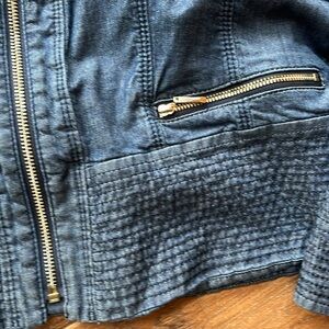 Cute WHBM denim jacket, Size 14, zip front, collared, three zip bottomm pockets, accent stitching Ching aroundd bottom and sleeves, slits onboth 7/8 length sleeves, armpit to armpit approximately 20” across, approximately 21” long, lyocell/cotton/spandex, lightly worn