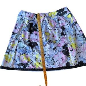Womens Ralph Lauren Golf Skort in multi-colored floral print in shades of blue, yellow, green and pink on a white background with black trim. Undershorts are a pale green shade with ball pocket on thigh. Two front zipper pockets and one rear hip pocket. Gently pre-owned in very good condition, showing very little use. Material is easy care 85% Polyester, 15% Elastane. Machine wash cold; tumble dry low.