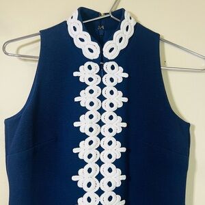 Chic navy mini dress with bold white accents. Perfect for stylish outings.