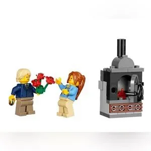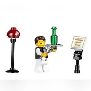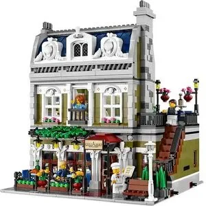 It’s very busy in the Parisian Restaurant! As a scooter zips by, inside the waiter rushes between the tables as the nervous young man gets ready to propose with the ring! It’s just as hectic behind the scenes, with the chef busily preparing the food. This beautifully detailed building is the setting for so many stories and is a great addition to the modular building series. The Parisian Restaurant has a fully-stocked, blue and white tiled kitchen with tableware as well as a cozy apartment with pull-down bed, kitchenette and fireplace. On the top floor is the artist’s room with a studio that includes a cast iron heater, easel, paintbrush and two works of art by the aspiring artist. Outside, stairs lead down to the roof terrace lined with hanging lanterns and flowers where the diners eat alfresco-style. This amazing Parisian Restaurant model even includes a facade with croissants, clams and feather details that recapture the feel of Paris. Includes 5 minifigures: chef, waiter, girl and a romantic couple.