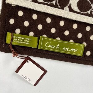 Coach Signature C Scarf in a brown and cream color scheme. It features the brand's signature "C" logo pattern on one side and a polka-dot pattern on the reverse.