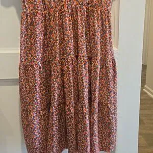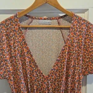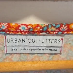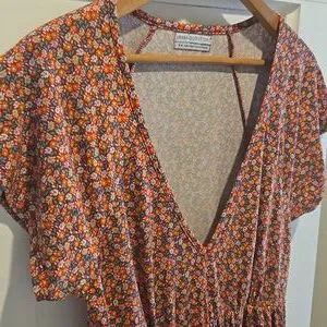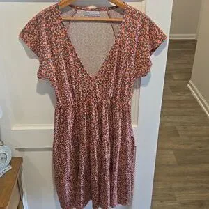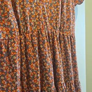 Vibrant floral dress with red and teal blue accents. Perfect for casual wear.