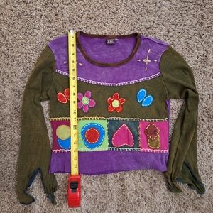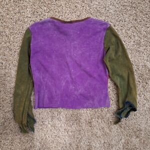 KPC purple and green patchwork long sleeve crop top with a boho, hippie vibe. Made in Nepal, size M