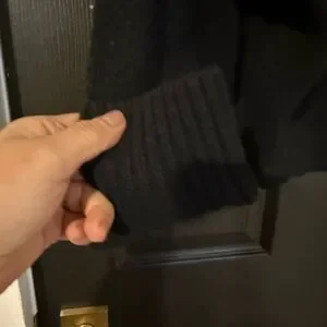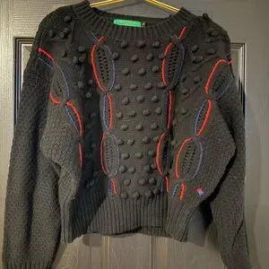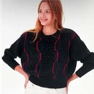 Chic black sweater with red accents. Unique textured design. Perfect for layering.