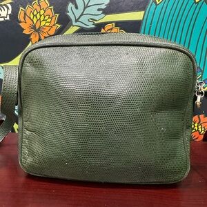 Beautiful vintage Ferragamo crossbody in rare deep olive green lizard-embossed leather, finished with the iconic Vara bow and engraved gold-tone hardware. This late-80s/early-90s design features a structured rectangular silhouette, adjustable strap, and a full leather interior with slip pockets.
