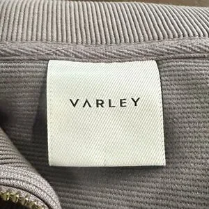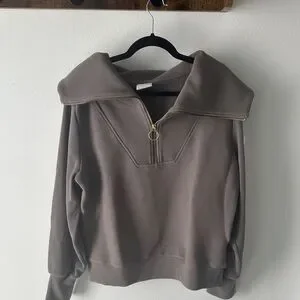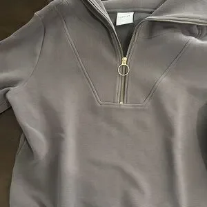 Elegant taupe top with ribbed texture. Features a stylish ring zipper pull.