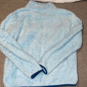 Cozy Lilly Pulitzer teddy jacket in light blue. Features a half-zip front. Soft and stylish.