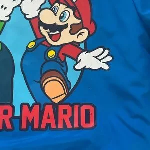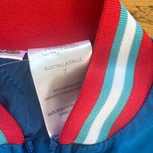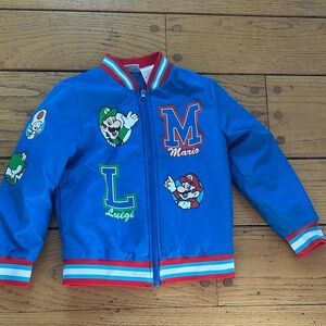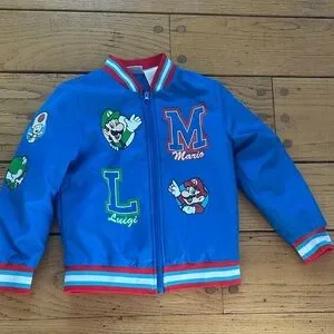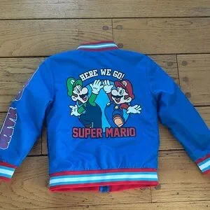 Vibrant blue jacket featuring Mario and Luigi. Red and white striped accents. Perfect for young fans.