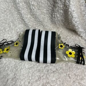 Make a bold statement with these clear platform heeled boots adorned with vibrant yellow floral accents. Perfect for adding a playful touch to your outfit.