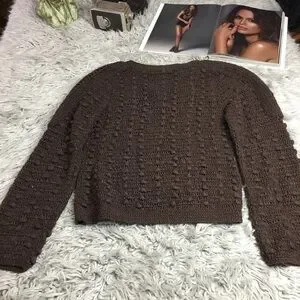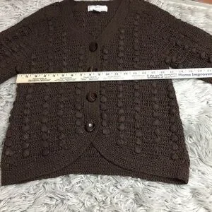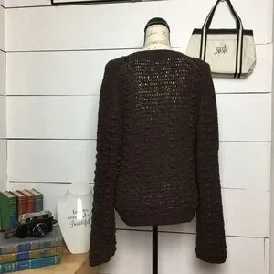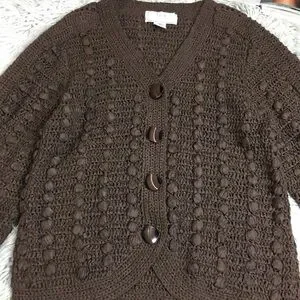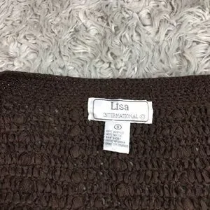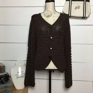 Classic vintage Lisa International cardigan sweater featuring a rich brown tone and a chunky textured knit. Button-front design with a relaxed, cozy silhouette that layers beautifully over tees or dresses.