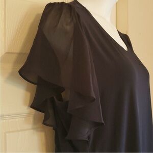 Sheer flutter sleeve mixed media blouse. dark navy. good condition. the body is a stretchy knit and the sleeves are a sheer poly chiffon. very flattering and feminine.