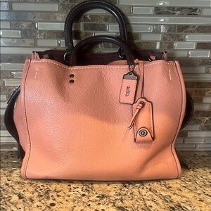 Chic CoachRogue satchel in coral leather. Features dual handles and signature tag. Perfect for everyday elegance.