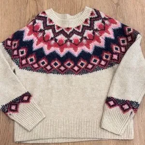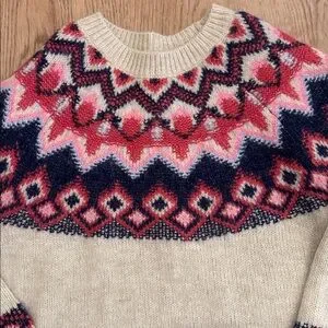 Chic Fair Isle design. Cream base with pink and navy accents. Perfect for casual wear.