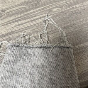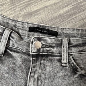 Chic light gray ankle jeans. Perfect for casual wear. Stylish and comfortable with a fabric blend of 63% cotton, 32% poly, 3% rayon, and 2% spandex. The jeans feature a black acid wash with a classic five pocket design and button and zip closure. The hem lines are raw. Front rise 10 inches inseam 26 inches.