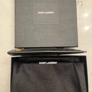 Saint Laurent monogram gusseted zip credit card holder with a coin purse and tiny interlaced metal YSL initials.