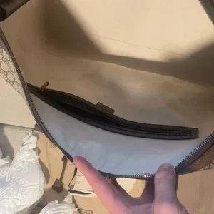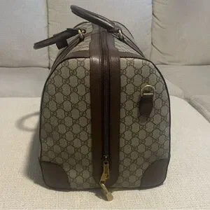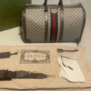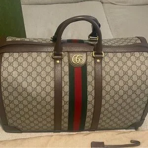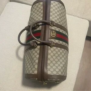 Stylish and spacious, this Gucci men's travel bag features a classic brown design with green and red accents. Perfect for any journey.