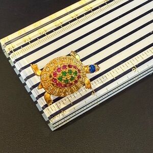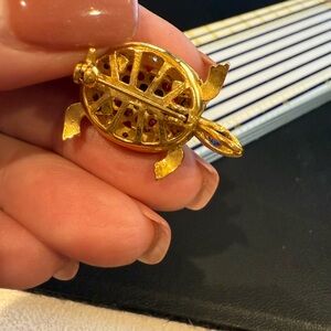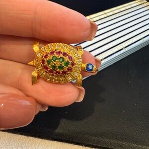 Gorgeous turtle brooch in a pretty shiny bright gold with vibrant stones. Turtles legs and head move. So cute! Can be worn as a necklace pendant as well.