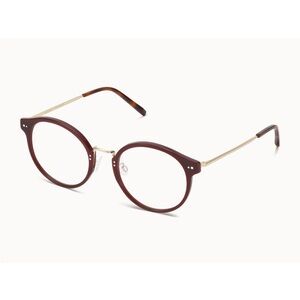 Warby Parker Jayla wide glasses. Oversized round glasses with burgundy frames and tortoise at the end of the metal arms. Includes a Warby Parker case.