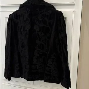 Chic black teddy jacket with removable luxurious faux fur collar. Elegant floral detailing. Perfect for adding sophistication to any outfit. Pet free smoke free home.