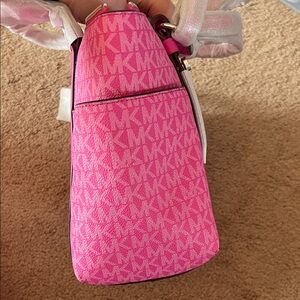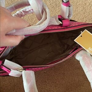Chic cerise (pink) tote with a monogrammed coated canvas and leather trim. Ideal for everyday style.
