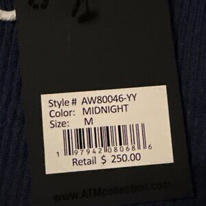 ATM Anthony Thomas Melillo navy blue short sleeve knit sweater with white tipping, size medium. Retail price $250, brand new with tags.