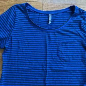 Charlotte Russe. Stylish blue and dark gray striped top, perfect for casual outings. Round neck and small pocket to left breast area. Size medium. Soft and comfortable fabric. Preloved and in excellent condition. From a smoke and pet free home.