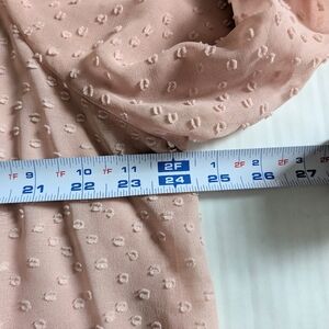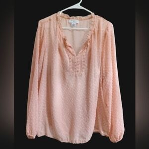 Liz Claiborne shirt with textured polka dot pattern, V neck with crocheted embroidered detail, long sleeve, elastic cuffs, layered sheer top with spaghetti strap tank top underneath.
