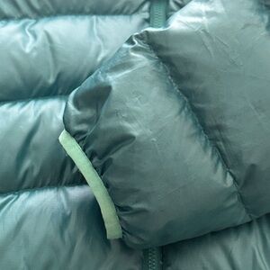 Aqua jacket with hood by Patagonia. Quilted design for warmth.