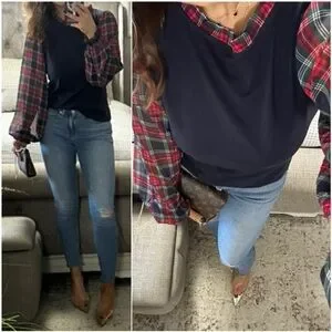 Olive Luxe pants size 6, evergreen cardigan s, plaid shacket s, red sparkle bow sweater m, velvet bow tie cardigan m, mushy Sherpa pullover m, gray cardigan m, Brownie sweater dress size 4, navy plaid long sleeve s, velvety sleeve top s