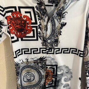White multicolored Greek multi patterned button up dress shirt, cotton blend shirt. See pics for more details.
