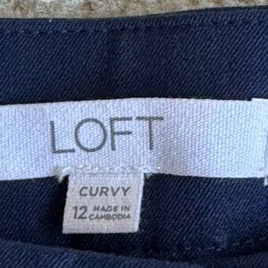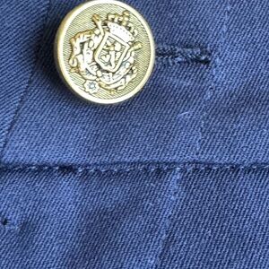 Stylish navy blue pants. Features gold button accents. Perfect for any occasion.