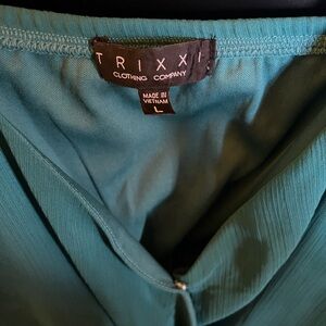 Trixxi clothing company Teal romper with adjustable spaghetti straps, V-neck, elastic drawstring waist, and a ruffled hem on the shorts. Comfortable flowy fabric.