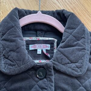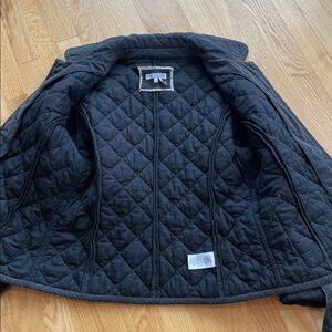 Never worn. Black. Thick quilt with beautiful details. Quality construction. Has pockets!! And belt. 98 cotton. 2 spandex.