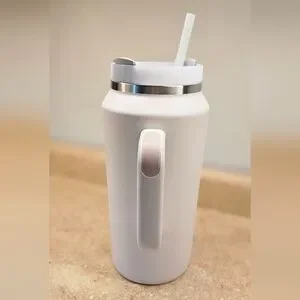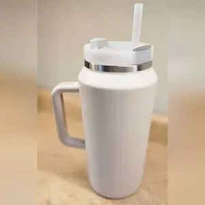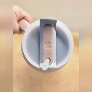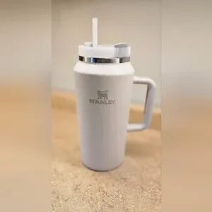 Stylish Stanley travel mug in light pink. Perfect for on-the-go use.