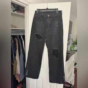 Black distressed jeans with ripped details and chains in cuff. Like new- no signs of wear. These fit like an 8/10.
