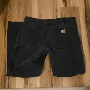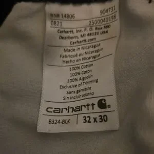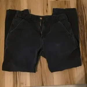 Durable black work pants by Carhartt. Ideal for tough jobs. Small hole back right pocket shown in picture. 32 waist x 30 inseam.