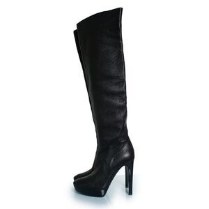 Delivery Duty Paid included – Burberry, black grained leather over knee platform boots. The item is in good condition with a small dent in the sole.<ul>