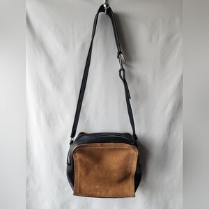 Phillip Lim, black leather and tan suede, cross body, square purse, top zipper, adjustable strap, great condition, general light wear, no major flaws.