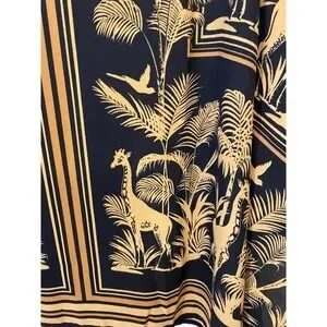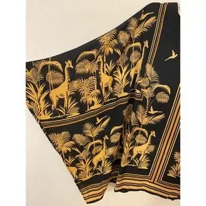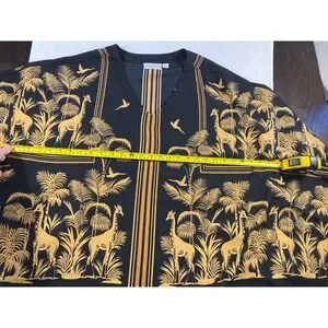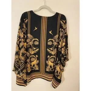Belle by Kim Gravel airy kaftan-style top in a striking black and gold safari print featuring giraffes, palms, and birds. The silky drape flatters beautifully, with generous flowy sleeves and a relaxed silhouette perfect for comfort and chic appeal.