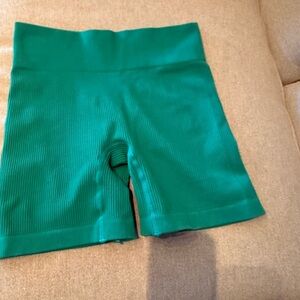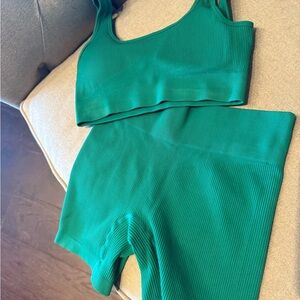 Emerald green seamless ribbed crop tank and high waist shorts. Ideal for yoga and workouts.