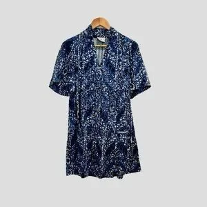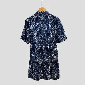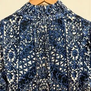 Elegant floral dress with intricate blue and white design. Ideal for any occasion.