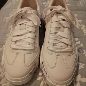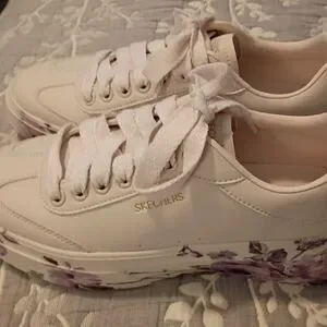 Step out in style with these Skechers women's sneakers. Featuring a chic white color, these shoes offer both comfort and elegance for everyday wear. Beautiful purple flowers. New and never worn.