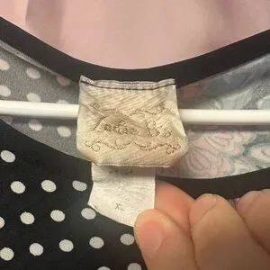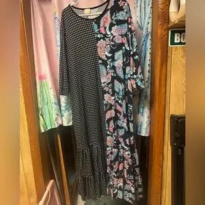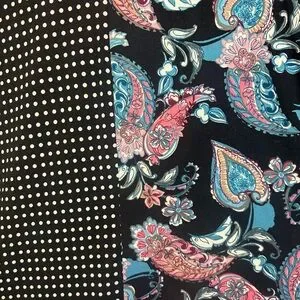This elegant dress features a striking combination of black polka dots and a vibrant blue paisley pattern. Perfect for any occasion, it offers a unique and stylish look.