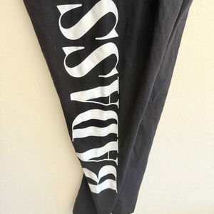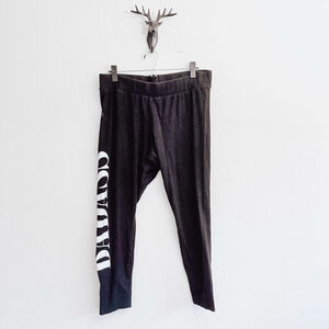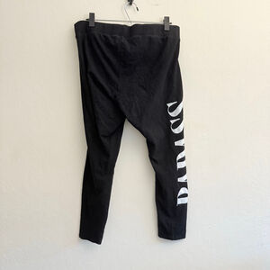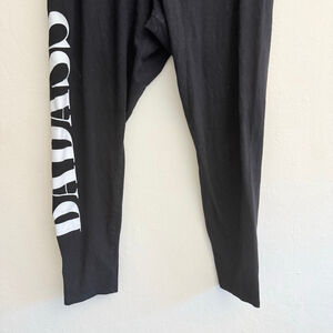 These black Torrid leggings, size 2, are crafted from 95% cotton and 5% spandex. They feature the word "BADASS" printed vertically in white along the outer side of the left leg. The fabric exhibits some general wear and slight fading, consistent with pre-owned apparel. They have an elastic waistband and a comfortable, stretchy fit, appearing to be full-length. The care tag indicates machine wash cold and tumble dry low.
