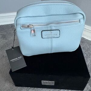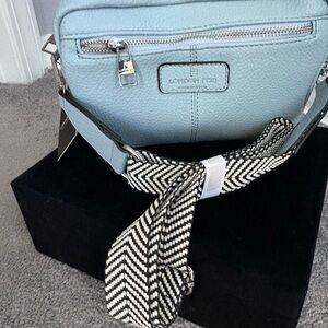 New! Chic light blue crossbody bag by London Fog. Features a textured design with a black and white patterned strap. Perfect for everyday use.