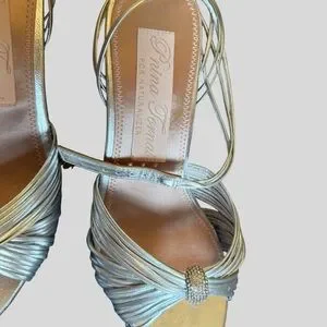 Stunning metallic silver Prina Tornai for Naturalizer heels featuring pleated straps, rhinestone knot detail, and elegant wrap ankle straps. Perfect for weddings, formal events, proms, or evening wear.
