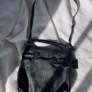 Sleek black leather tote. Features silver hardware. Stylish and versatile.